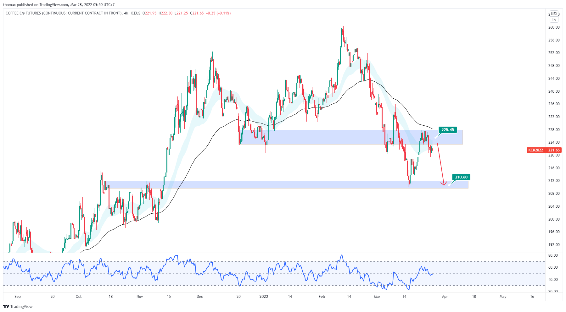 Cà phê Arabica đã giảm như kì vọng sau khi test kháng cự 225,45. Nếu tiếp tục giao dịch dưới vùng này nhà đầu tư có thể tiếp tục canh bán xuống về hỗ trợ 210,6, sl tại 233,6.