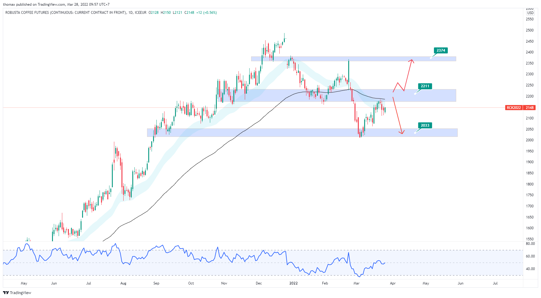 Cà phê Robusta sau khi test kháng cự vùng 2211 đã xuất hiện tín hiệu đảo chiều, tuy nhiên nến d1 đã xuất hiện lực mua trở lại. Nhà đầu tư nên đứng ngoài quan sát thêm, nếu tiếp tục giao dịch dưới vùng 2211 nên ưu tiên canh bán về vùng 2033, sl tại 2262. Trường hợp giá break khỏi vùng 2211 sẽ mua lên vùng 2347, sl tại 2140.