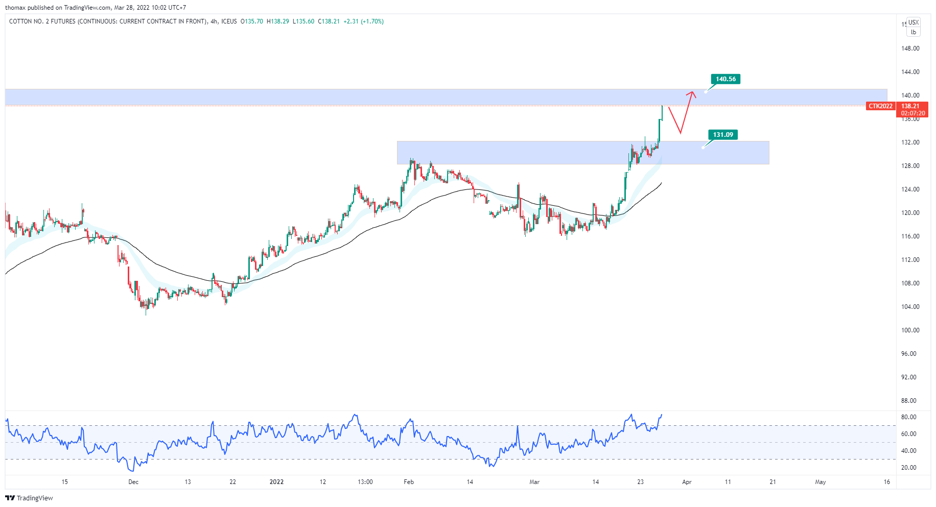 Bông đã tăng như kì vọng, hiện tại giá vẫn tiếp tục tăng và nhiều khả năng sẽ lên test vùng 140,56. Nhà đầu tư nên chờ giá điều chỉnh nhẹ về trên vùng 131,09 có tín hiệu tăng trở lại, tp tại 140,56, sl tại 127,67.