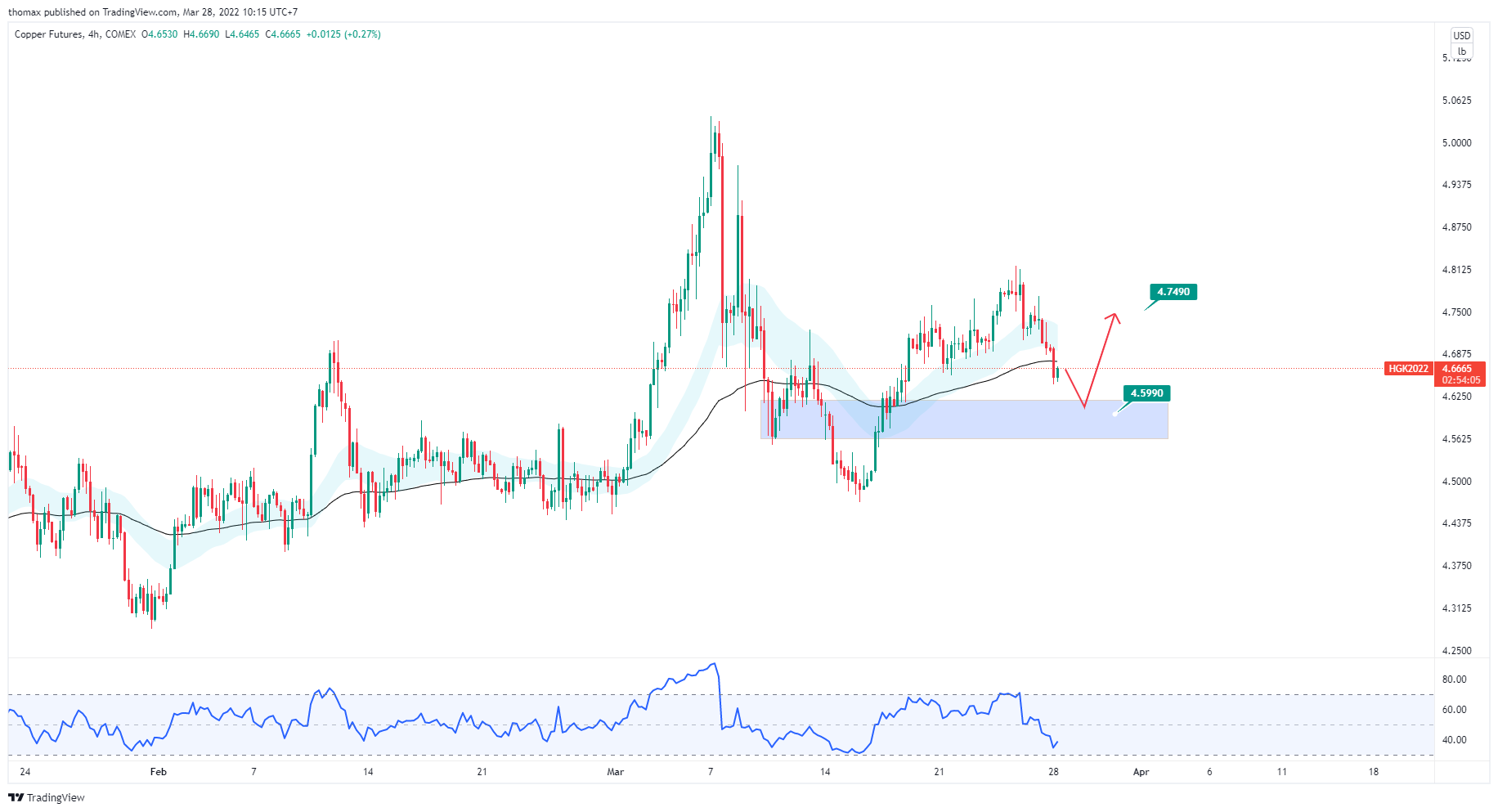Giá đồng tiếp tục đà giảm sau khi liên tiếp tạo cấu trúc giảm đỉnh sau thấp hơn đỉnh trước, đáy sau thấp hơn đáy trước. Tuy nhiên, giá đang tiệm cận về vùng hỗ trợ cũng là vùng mua tiềm năng 4,5990. Nhà đầu tư có thể xem xét tín hiệu đảo chiều tăng để mua lên vùng 4,7490, sl tại 4,5195.