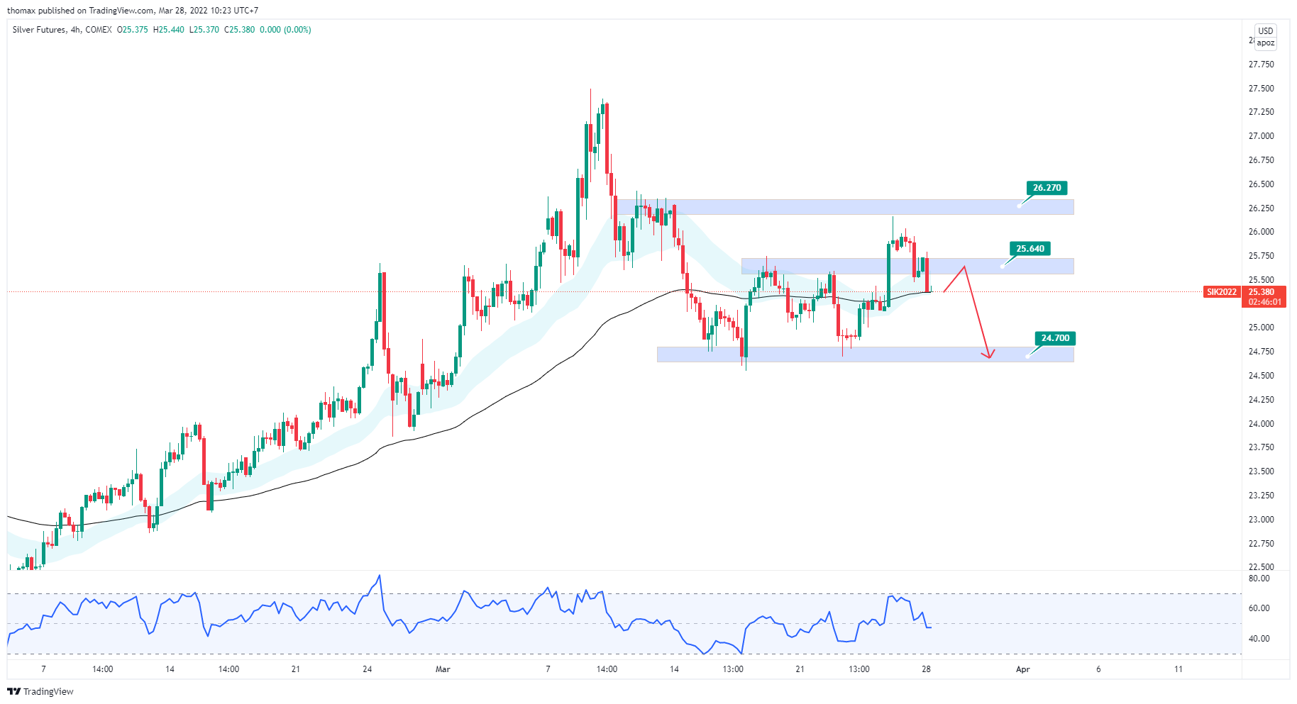Bạc sau khi test kháng cự 26,270 không thành công đã bị bán trở lại, hiện tại giá đã tạo cấu trúc giảm trên khung thời gian h4. Nhà đầu tư có thể xem xét mở vị thế bán nếu giá vẫn giao dịch dưới vùng 25,640, tp tại 24,700, sl tại 26,075.