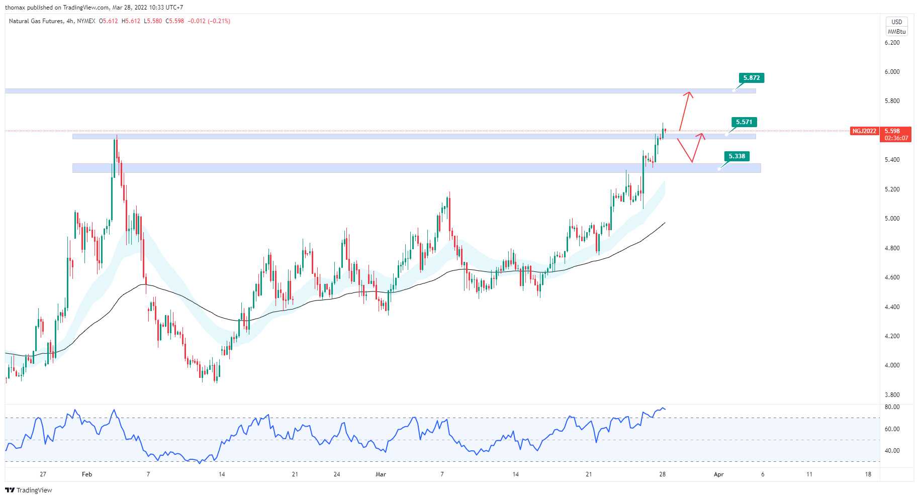 Khí tự nhiên tiếp tục tăng như kì vọng, hiện tại giá đã phá đỉnh cũ 5,571 và giao dich trên đó. Nhà đầu tư có thể tiếp tục mua lên hoặc đợi giá điều chỉnh về trên vùng 5,338 có tín hiệu tăng trở lại để mua lên, tp tại 5,872, sl tại 5,136.
