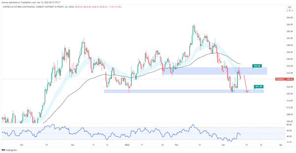 Cà phê Arabica sau khi hồi phục test kháng cự 233,65 đã bị bán trở lại, giá vẫn giao dịch dưới dải ma khung thời gian h4. Nhà đầu tư nên tiếp tục canh bán xuống khi giá vẫn ở dưới vùng 233,65, tp tại 221,7, sl tại 2239.