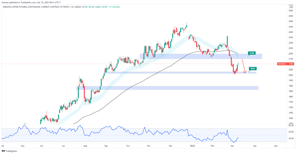 Cà phê Robusta sau khi giảm về hỗ trợ 2022 đang hồi phục trở lại, nhiều khả năng giá sẽ lên test lại kháng cự 2166. Nếu tại đó giá có dấu hiệu đảo chiều giảm nhà đầu tư nên ưu tiên mở vị thế bán xuống, tp tại 2022, sl tại 2279.