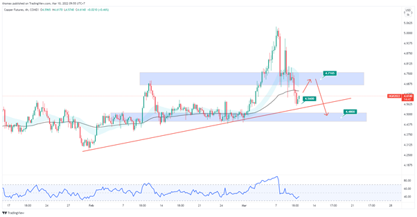 Giá đồng tiếp tục bị bán về đường xu hướng tăng vùng 4,5600 và có dấu hiệu hồi phục trở lại. Nhiều khả năng giá sẽ lên test kháng cự 4,7165, tại đó có tín hiệu đảo chiều giảm trở lại sẽ ưu tiên bán xuống về vùng 4,4800, sl tại 4,8210.