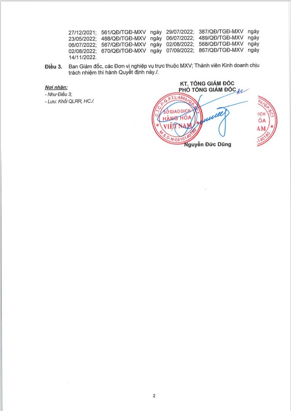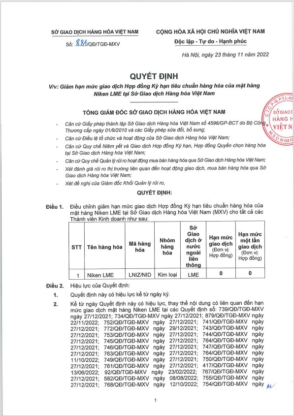 Kính gửi: Quý Khách hàng, Theo quyết định của Sở Giao dịch hàng hóa Việt Nam (MXV), AIMS Futures gửi đến Quý Khách hàng Quyết định số 881/QĐ/TGĐ-MXV về việc giảm hạn mức giao dịch Hợp đồng Kỳ hạn tiêu chuẩn hàng hóa của mặt hàng Niken LME tại Sở Giao dịch hàng hóa Việt Nam từ ngày 23/11/2022.