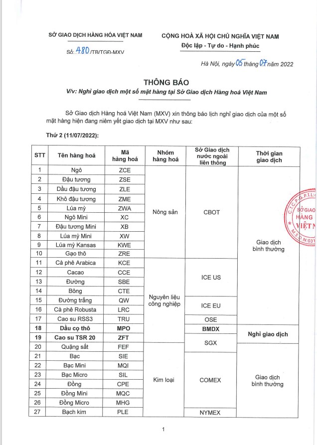 AIMS FUTURES VIỆT NAM gửi đến Quý Khách hàng Thông báo số 480/TB/TGĐ-MXV về Lịch nghỉ giao dịch một số mặt hàng tại Sở Giao dịch Hàng hóa Việt Nam vào ngày 11/07/2022.