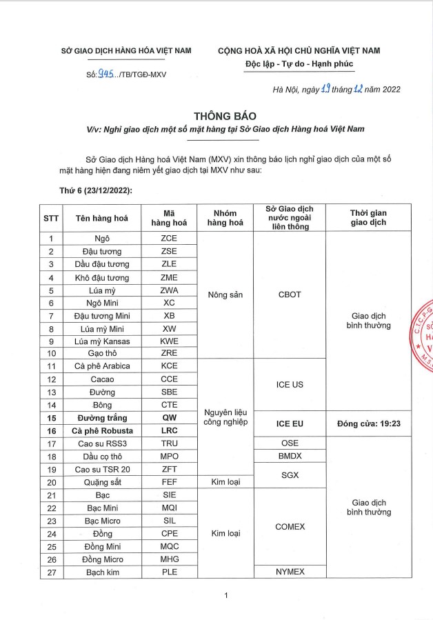 AIMS FUTURES VIỆT NAM gửi đến Quý Khách hàng Thông báo số 945/TB/TGĐ-MXV về Lịch nghỉ giao dịch một số mặt hàng tại Sở Giao dịch Hàng hóa Việt Nam ngày 23,26 & 27/12/2022.