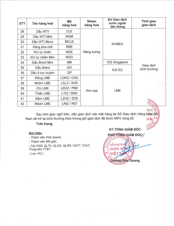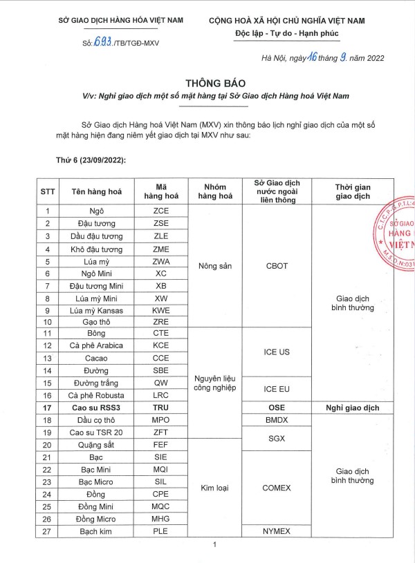 Thông Báo Lịch Nghỉ Giao Dịch Một Số Sản Phẩm Tại Sở Giao Dịch Hàng Hoá Việt Nam ( 23/09/2022 )
