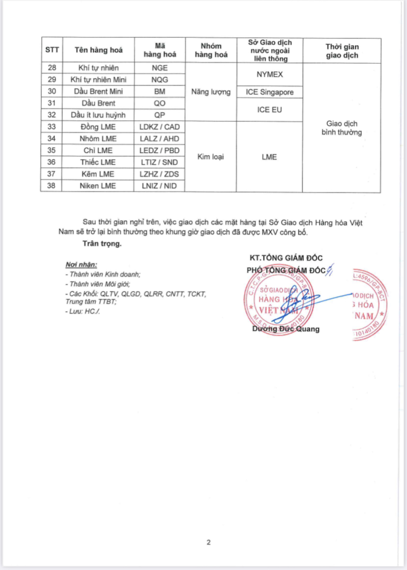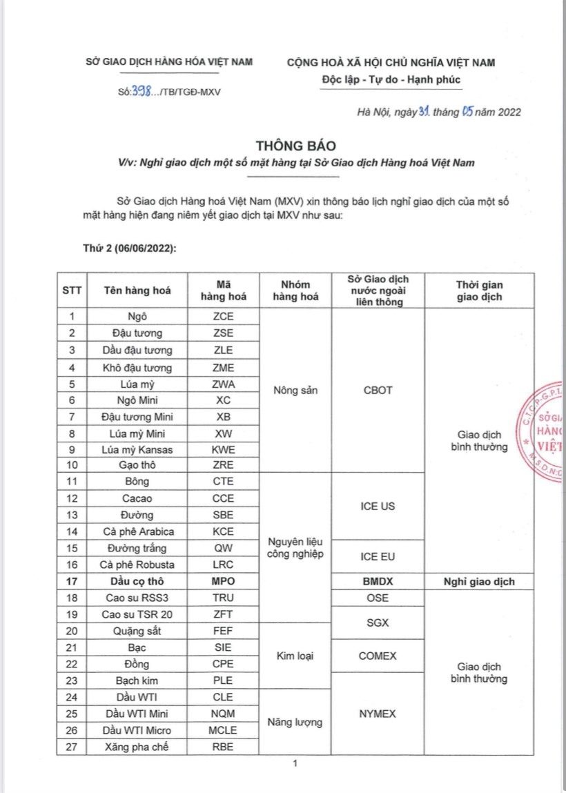 Thông Báo Lịch Nghỉ Giao Dịch Một Số Sản Phẩm Tại Sở Giao Dịch Hàng Hoá Việt Nam (06/06/2022)