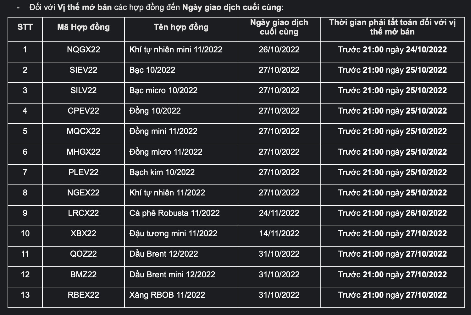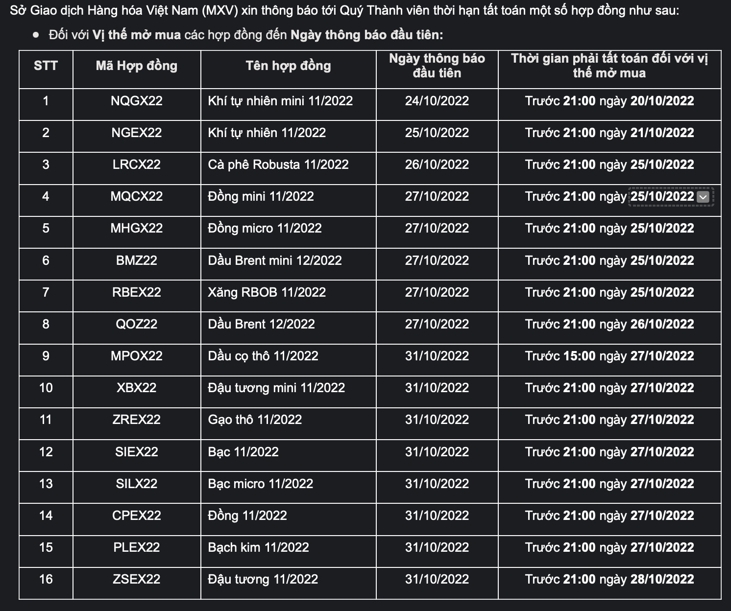 Kính gửi: Quý Khách hàng, căn cứ thông báo của Sở Giao dịch Hàng hóa Việt Nam (MXV), AIMS Fututes Việt Nam xin thông báo tới Quý Khách hàng thời hạn tất toán hợp đồng từ 20 – 27/10 như sau: