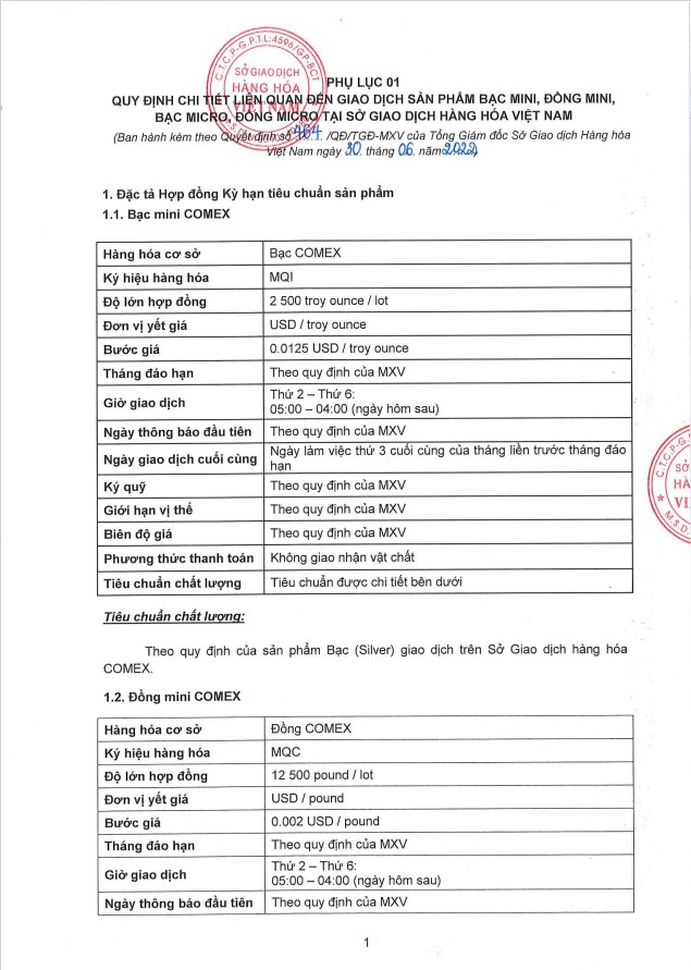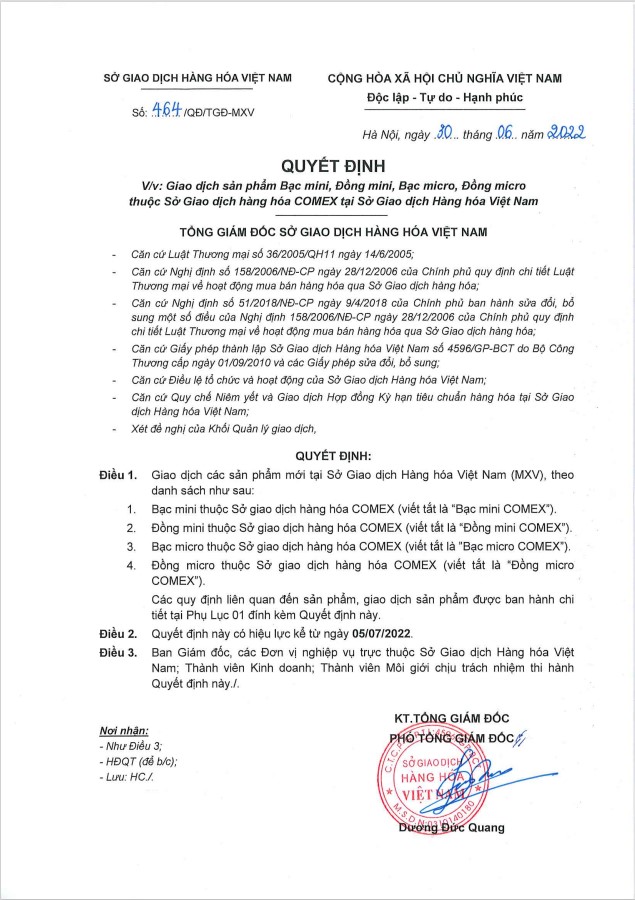 Kính gửi: Quý Khách hàng, Căn cứ theo thông báo của Sở Giao dịch Hàng hóa Việt Nam, AIMS Futures Việt Nam gửi đến Quý Khách hàng Quyết định số Quyết định số 464QĐ/TGĐ-MXV ngày 01/07/2022 liên quan đến các sản phẩm mới: Bạc mini. Đồng mini, Bạc micro, Đồng micro thuộc sở giao dịch hàng hoá COMEX áp dụng giao dịch tại MXV từ phiên ngày 05/07/2022